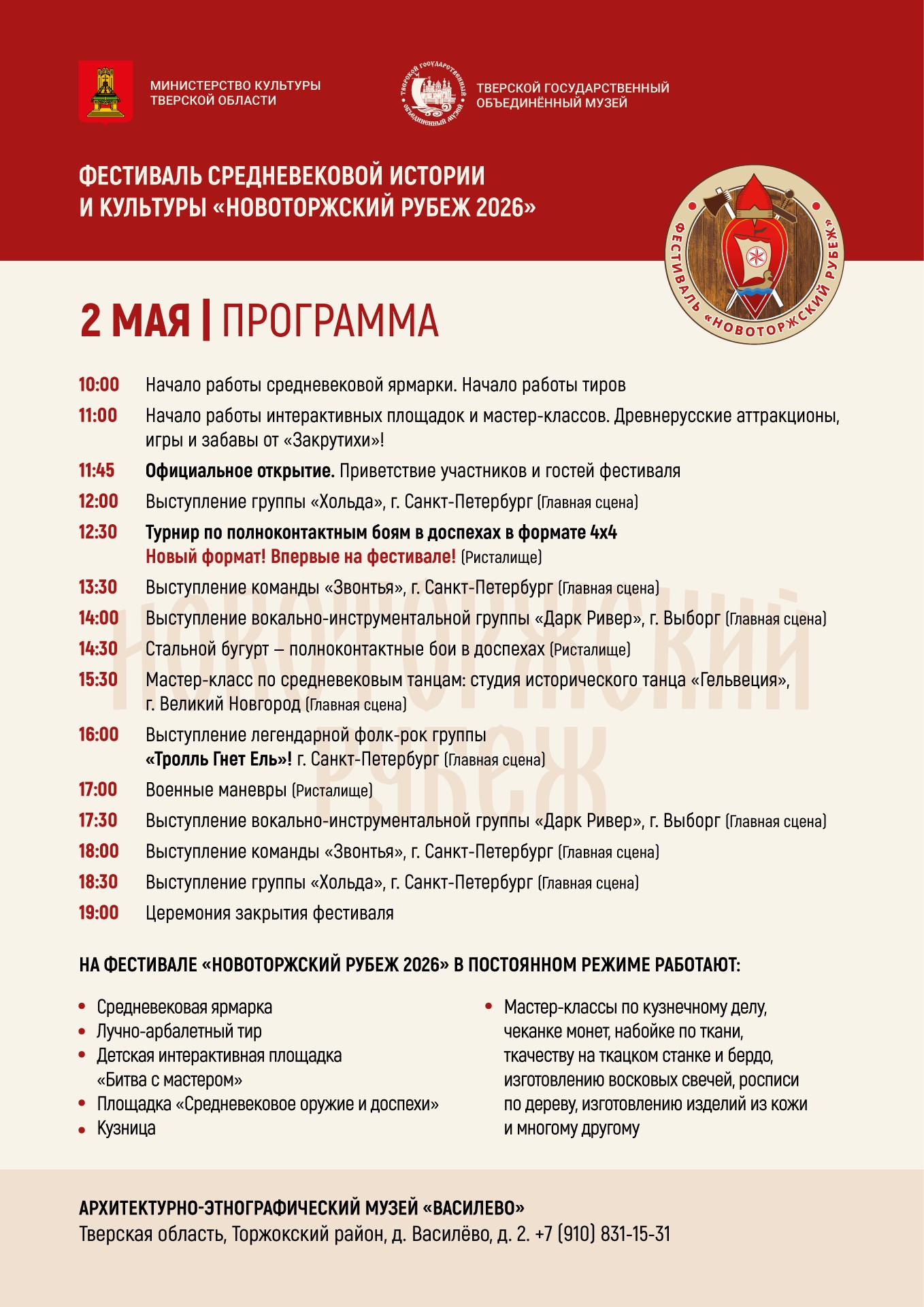 2 мая 2026 года на территории Архитектурно‑этнографического музея «Василёво» пройдёт 13‑й фестиваль средневековой истории и культуры «Новоторжский рубеж».