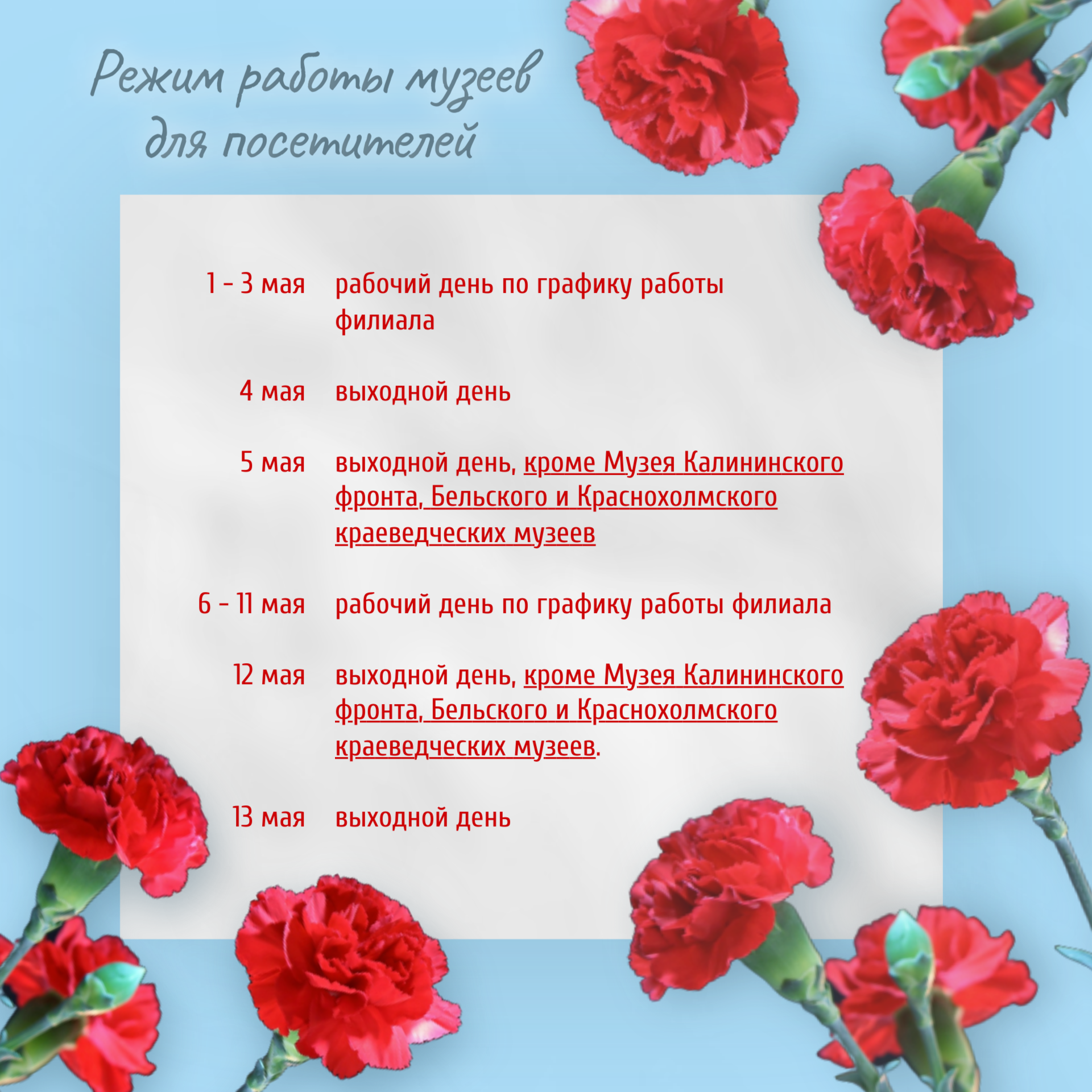 Уважаемые посетители, публикуем график работы музеев в период майских праздников.