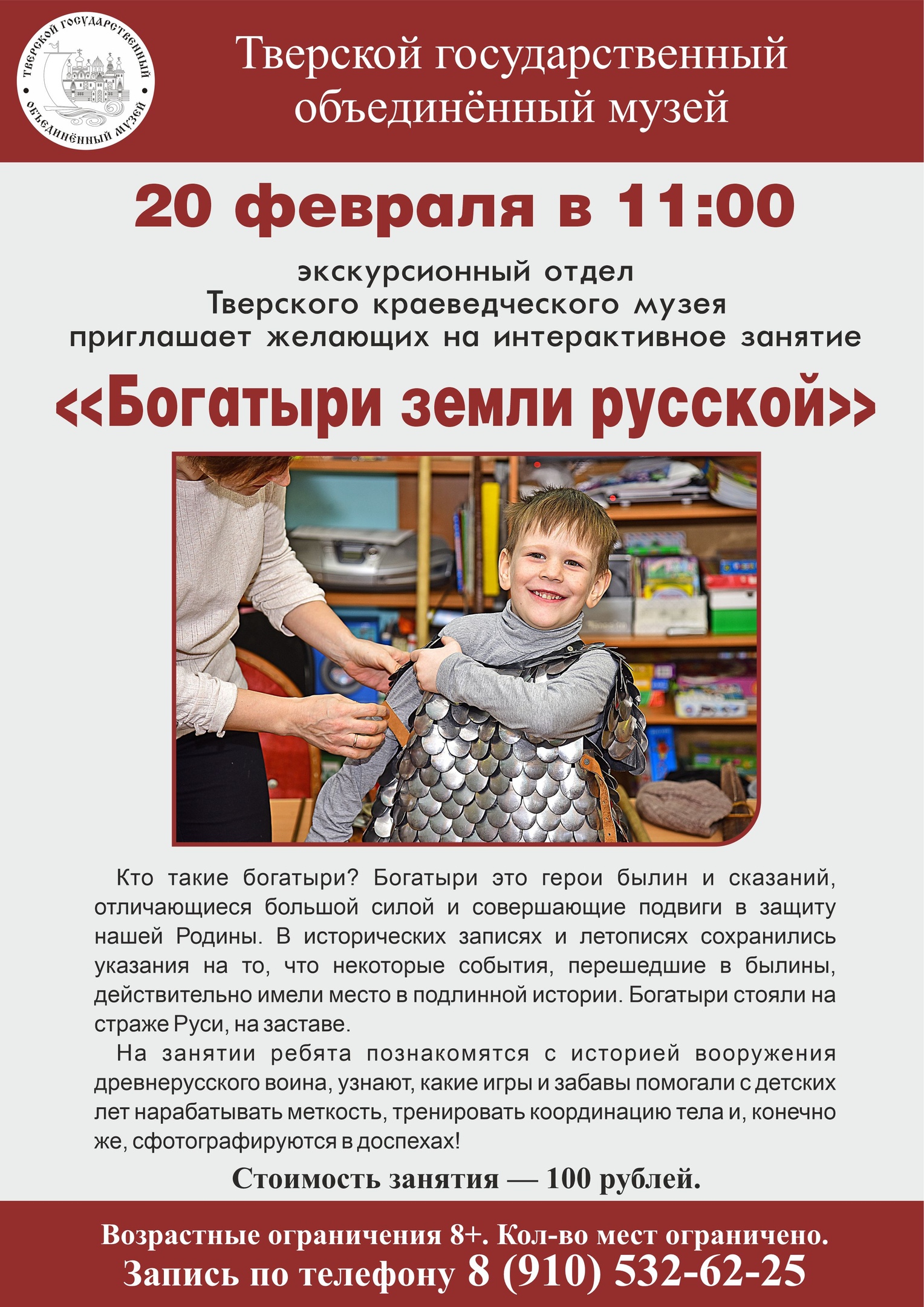 Экскурсионно-массовый отдел Тверского государственного объединенного музея. Интерактивное занятие «Богатыри земли русской». На занятии дети познакомятся с историей вооружения древнерусского воина, узнают, какие игры и забавы помогали с вырабатывать меткость, координацию тела, конечно, примерят доспехи воина.